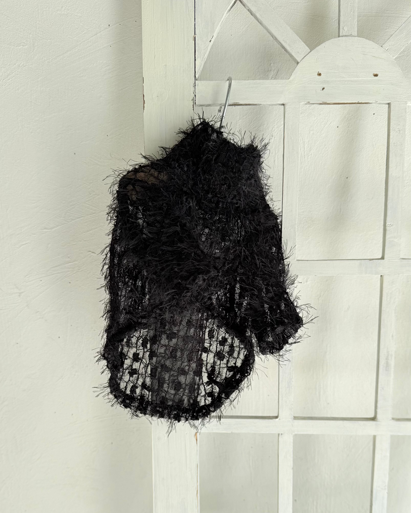 毛足のあるレース生地で仕立てたハイネックトップス。