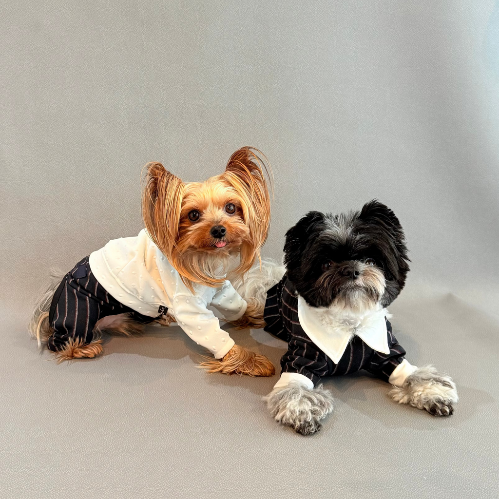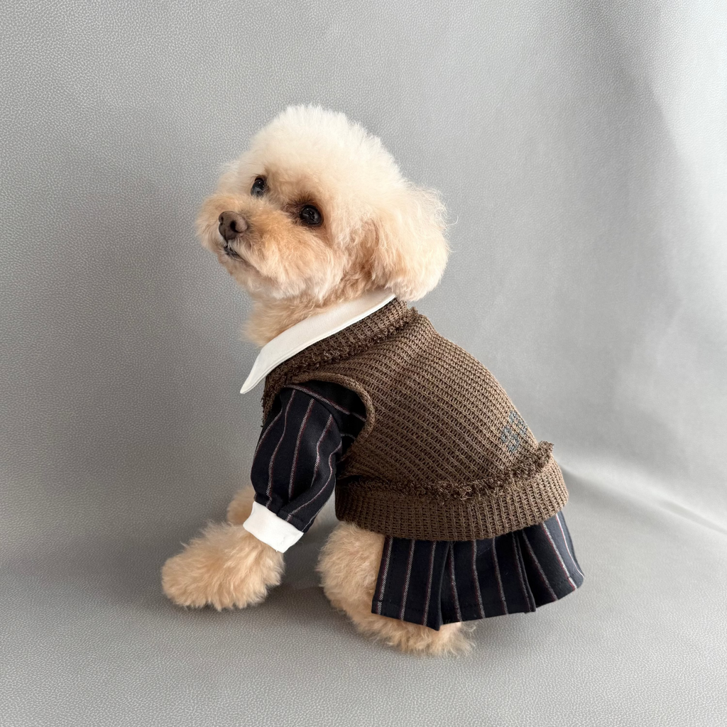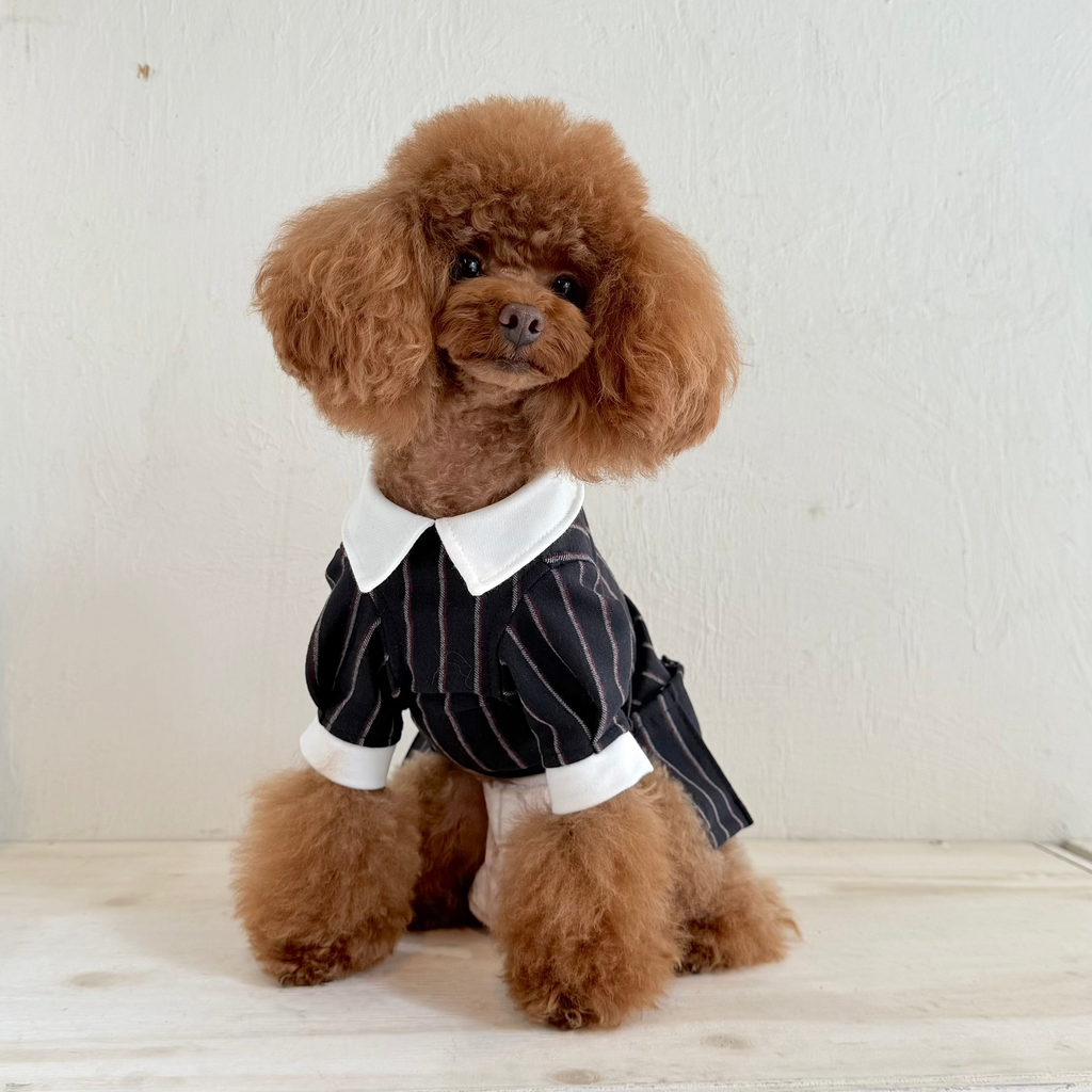 首もとの蜂のボタンも隠れたアクセントです